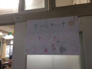 新聞紙で作ったボールをバケツ、スーパーの袋、紙コップの3つに分けキャッチします。