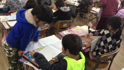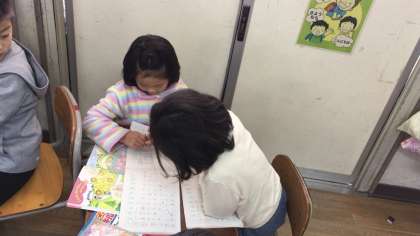 お話ができると、友だち同士で見せ合って「とりは羽と数えるよ」「合わせるとを使うと足し算になるよ」と、アドバイスをし合って勉強しました。