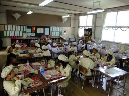 平成26年度の給食がスタートしました。1年生にとっては、初めての給食です。「お!おいしそうやなぁ」「牛乳キャップ、どうやってあけるの?」と、わくわくどきどきの様子でした。