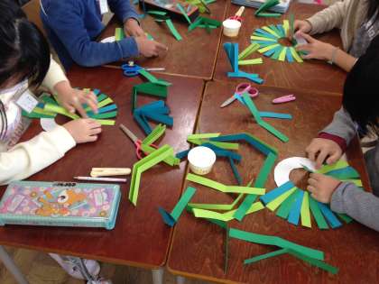 形ができると、紙ばねや折り紙を使って飾りつけをしました。