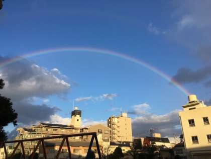 夕方、1年生の教室から、大きな大きなにじが2つも校庭にかかっているのが見えました。
