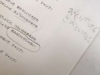 今日は歌詞を見て、次の一年生に伝えたい言葉とその理由を考えました。