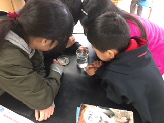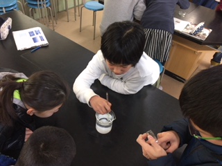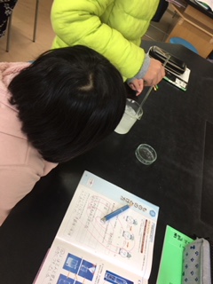 「もののとけ方」という新しい学習に入り、岩塩が水に溶けていく様子を実験しました。
