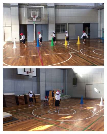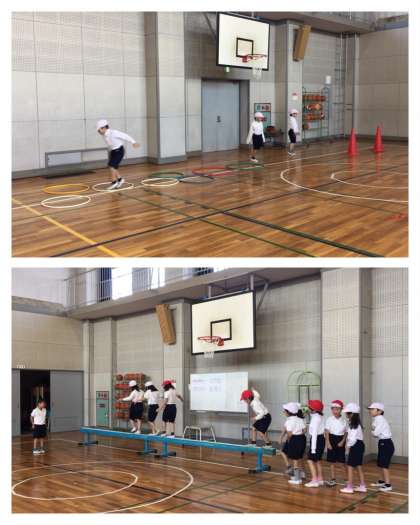 今日の体育では、マットや平均台・フラフープ等を使ってさまざまな動きをサーキット形式で挑戦しました。