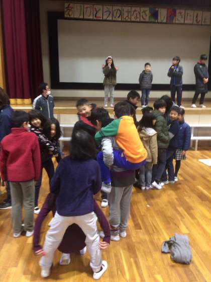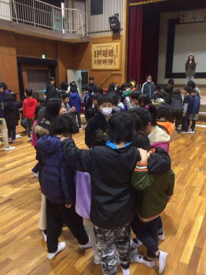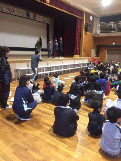 児童集会では、1〜6年生の子どもたちが一緒に活動するたてわり班で行っています。