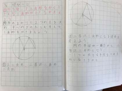 今日は、円を使って三角形をかく勉強をしました。