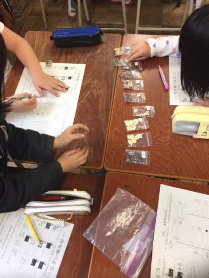 給食に出てくる10種類の実物を見て、豆の色や模様をヒントに名前を考えました。