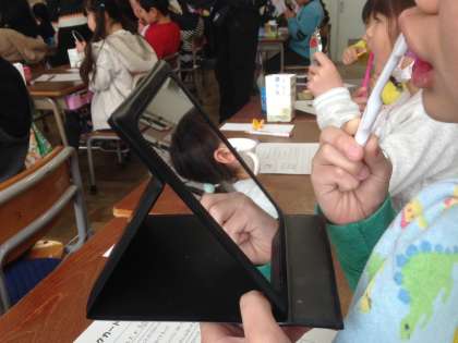 子どもたちは、薬をつけた前歯を鏡でしっかりと見てていねいに隅々までみがきました。1本ずつみがくことが大切だと教えていただきました。お家でも歯をみがく様子を見てあげてください。