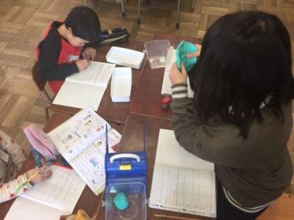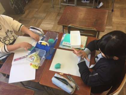 粘土の形を細長くのばしたり、小さい球をたくさん作ったりして色々な形を作って実験しました。