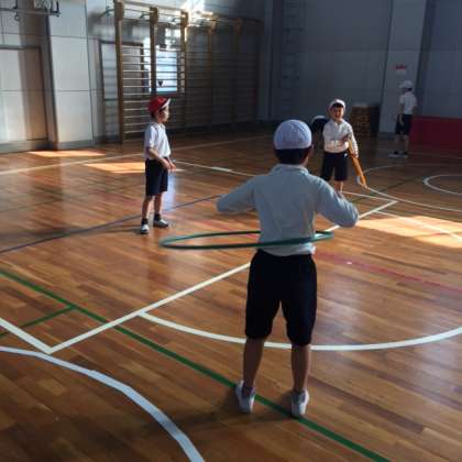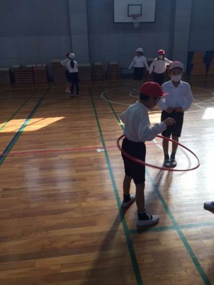 最後にフラフープを使って「輪転がし」「輪投げ」などをしました。フラフープを長く回し続けることができ、友だちから「すごいね」とほめられていました。