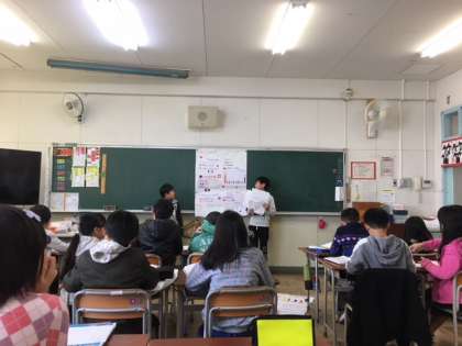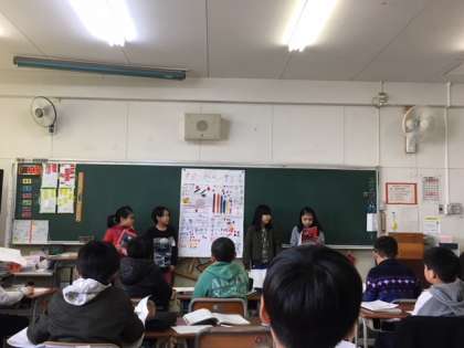 読書チーム、言葉遣いチーム、ゲームチーム(2組)、食生活チーム(2組)で、協力して作ってきた資料を使いながら報告をしました。