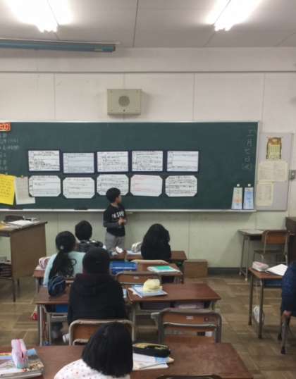 地域のおじいさん・おばあさんやお父さん・お母さんにインタビューしたことを班ごとにそれぞれのホワイトボードにまとめて発表をしました。