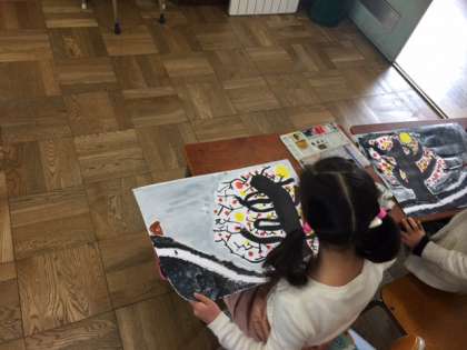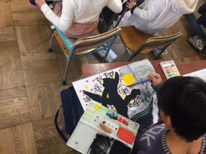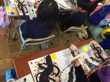 モチモチの木の周りに風景を描いて絵が完成しました。