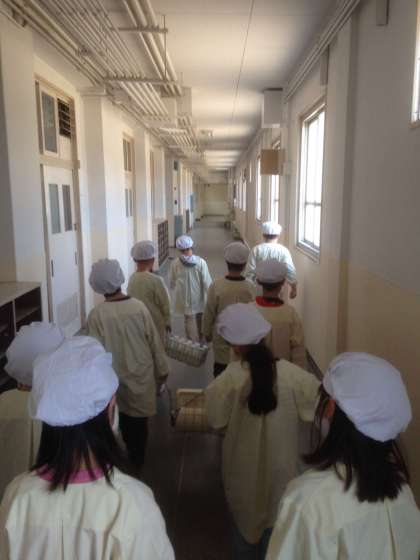 子どもたちは、給食室から教室まで「牛乳」「食器」「パン・ごはん」「おかず」などをそれぞれ役割分担して運搬しています。