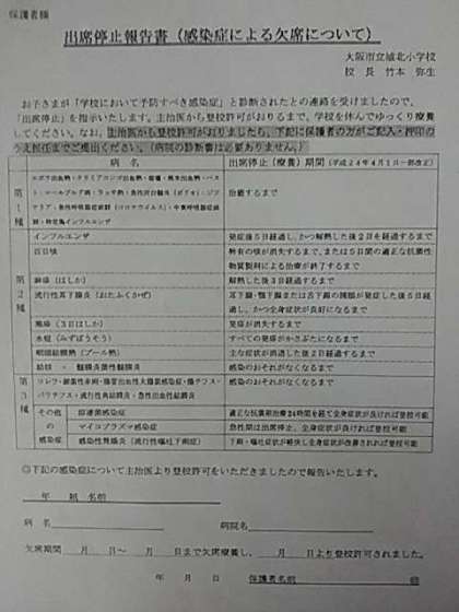 先日、4月のほけんだよりと一緒にお配りした「出席停止報告書」もご一読ください。