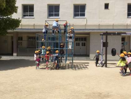 遊具の使い方や、遊び方のマナーを守って、1組も2組も仲よく遊ぶことができています。