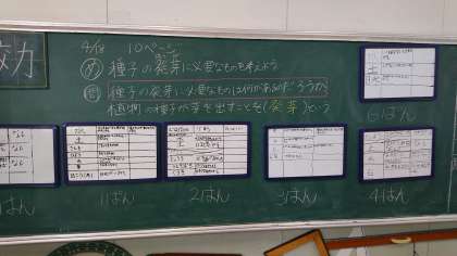植物の発芽する条件について、班で話し合って発表しました。