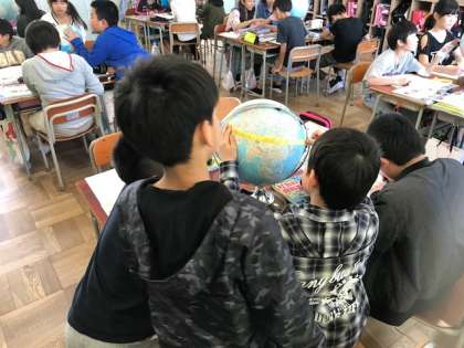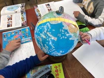 地球儀を使って日本からイギリスや、日本からバンコクへの距離を考えました。