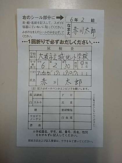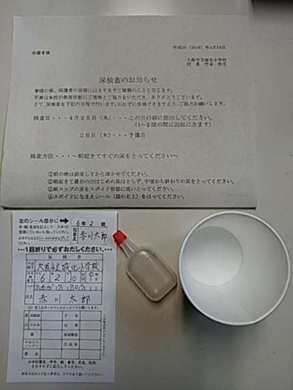 明日、4月25日(水)に尿検査検体の提出をお願いします。