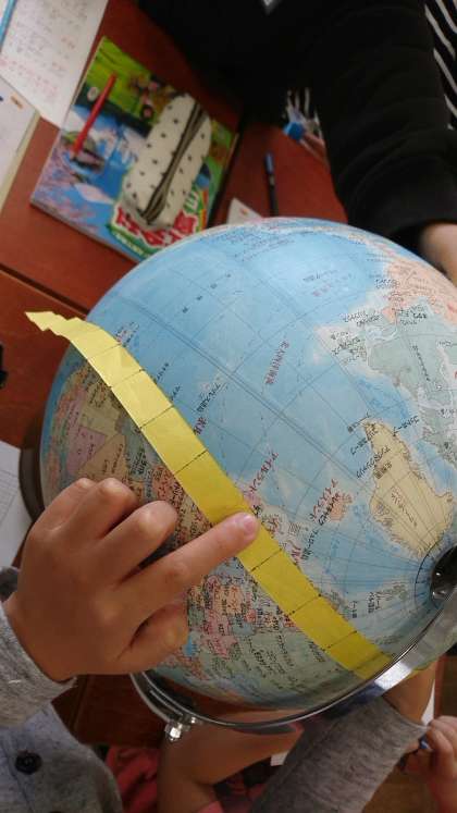 1メモリが1000kmのテープを使って、日本から世界の国々の距離や日本から東西南北に行くと交わる国を調べました。