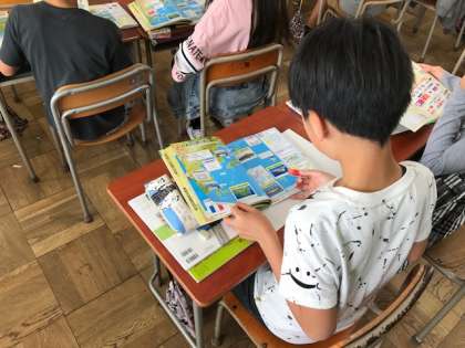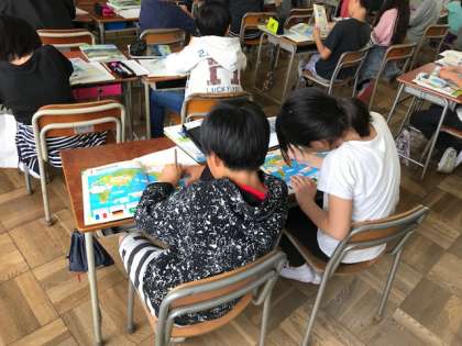 資料集の世界地図に国旗のシールを張りながら場所を確認しました。
