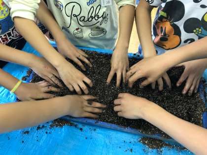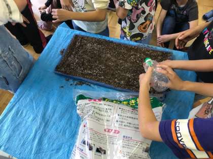 土に水いれてよくかき混ぜ、種をていねいに植えました。