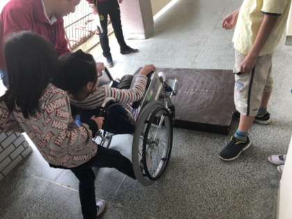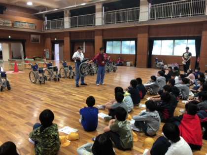 実際に車いすに乗って体育館に設置したコースを自走したり、校舎内のコースを友だちを介助する体験を行いました。