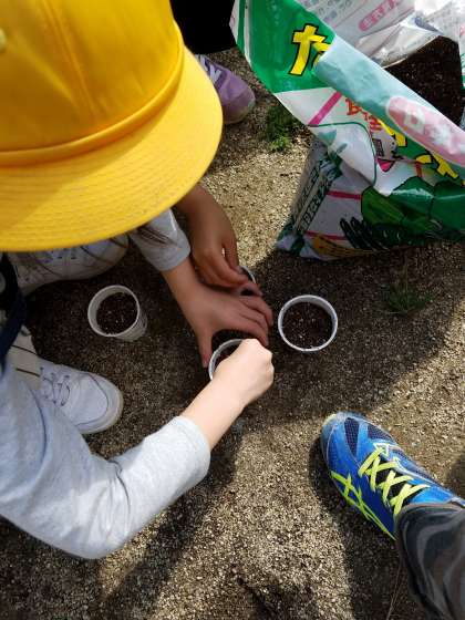 「元気に育ちますように!」「大きくなってね!」種まきを終えて水やりをしながら、子どもたちは口々に種に向かって話しかけていました。