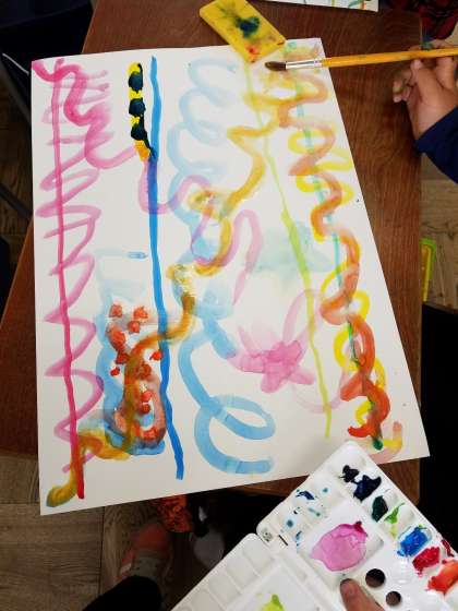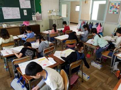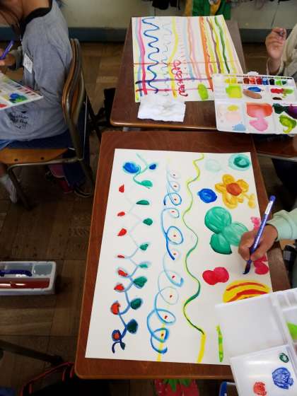 5月10日(木) 3年生 図工「色・形・いいかんじ!」 公開日 2018/05/11 更新日 2018/05/11 3年生 絵の具を使って、太い線・細い線・波線やいろいろな形を思いのままに描きました。「うわぁ!イナズマみたいになった!」「ねぇ見て!この色きれいでしょ」ぐうぜんできた色や形を友だちと交流し、楽しい作品になりました。 いいね(0)