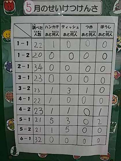 5月は1年2組、2年1組、3年1組、6年1組が全員○でした。