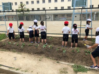 今日は、昨日植えたサツマイモに水をあげました。