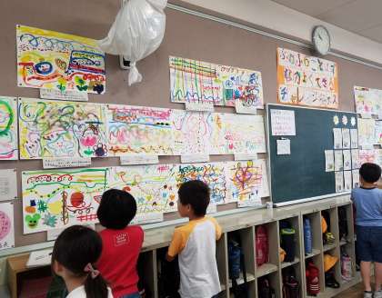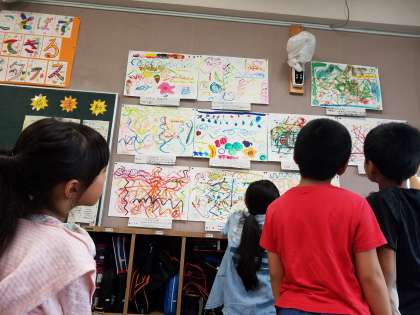 「色・形・いいかんじ!」の作品を教室に掲示し、友だちの作品を鑑賞する活動を行いました。「ジャングルみたいでおもしろい。」「お花の点々がまるで花火みたい。」友だちの作品のよさやおもしろさを感じ取ることができました。
