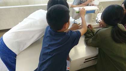 先生が見本で下糸の準備をしたり、上糸をかけたりしたときは真剣に見ていました。