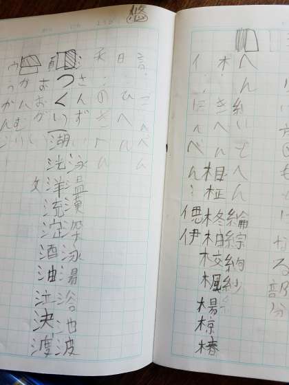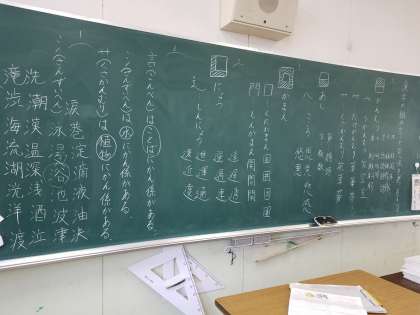 国語の時間に「部首」について学習しました。“さんずい”や“くさかんむり”“しんにょう”などの漢字を、国語辞典や漢字ドリルを使ってたくさん探す活動を行いました。まだ学習していない漢字も、どんどん見つけてノートに書き込んでいく子どもたち、気づけば黒板いっぱいに漢字が並びました。