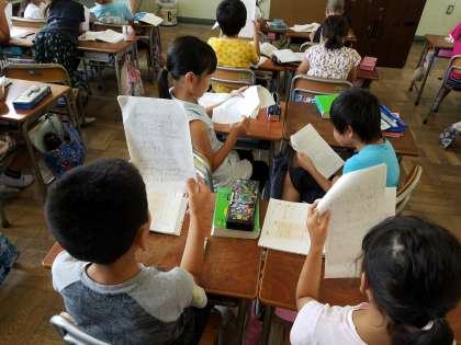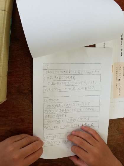 国語の時間に書いてきた“わたしのレポート”が完成しました。友だちと見せ合いをする前に、よりよい文章になるように“推敲(すいこう)”をする時間を取りました。じっくり読み直し、漢字の間違いを直したり、「〜だそうです。」と伝聞の形に書き直す児童もいました。
