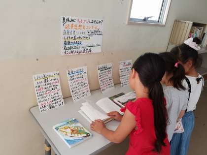 教室の前にコンクールの課題図書になっている4冊を展示し、紹介文をつけました。子どもたちは、興味のある本を手に取って、読んでいる様子が見られます。長い夏休み、たくさんの本と出会ってほしいと思います。