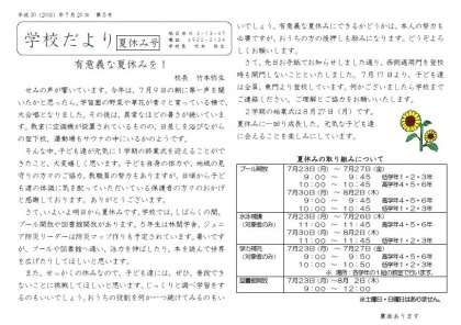 来週から、プール開放や図書館開放など、夏休みの様々な取り組みがあります。日にちや時間を確認して、たくさん参加してくださいね。