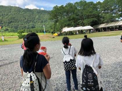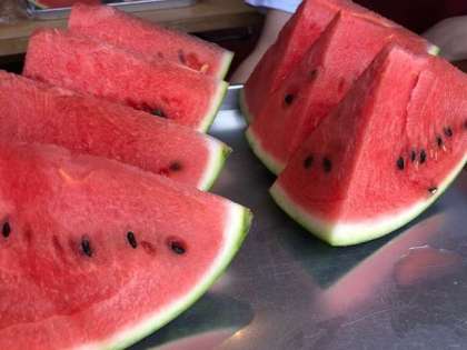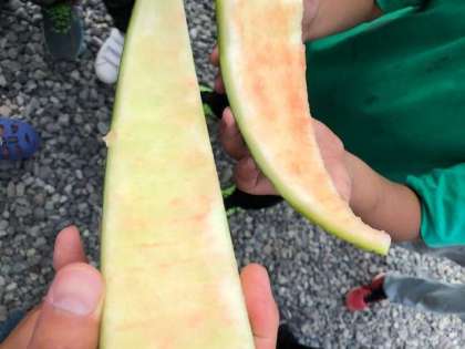 焼き板工作の後は、少し休憩。スイカをいただきました。赤い部分が見えなくなるまで美味しくいただきました。