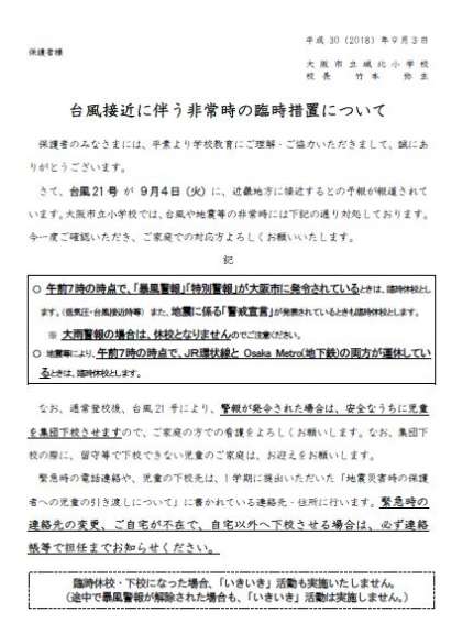 本日、児童に配付しました。台風21号が4日(火)に、近畿地方に接近するとの予報が報道されています。台風や地震等の非常時には下記の通り対処しております。今一度ご確認いただき、ご家庭での対応方よろしくお願いいたします。