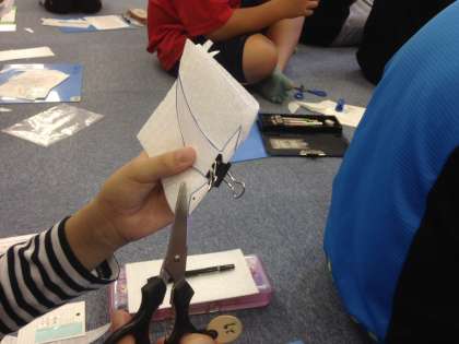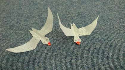 材料は薄い発泡スチロールで、型紙に合わせて切ると、つばめの形の完成です。切ったつばめにシールを貼って、重さを調整します。