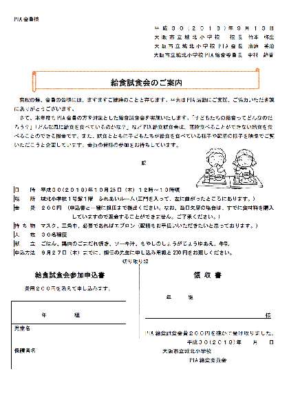 PTA給食試食会が、10月25日(木)にあります。普段の子どもたちの給食を食べることができる1年に1回きりのチャンスです。