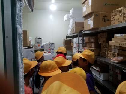 普段見ることのできない場所を見学させていただき、子どもたちは目を輝かせて店員の方のお話に聞き入っていました。どうして野菜をカットして売るのか、たくさんの包丁があるのはどうしてなのか、このバーコードは何なのか、子どもたちの疑問は尽きることがありません。