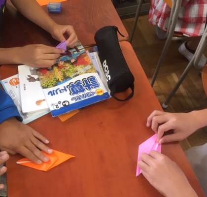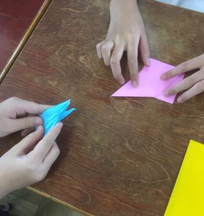 修学旅行に向けて、休み時間には平和を願い、鶴を折っています。今日の平和集会の後は、1年生にも鶴の折り方を教えてあげました。