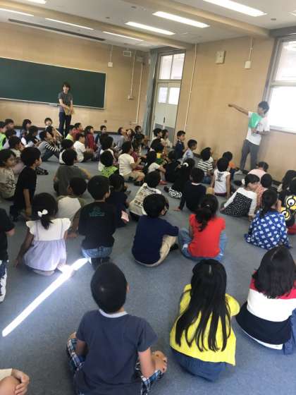 1、2年生合同のグループでキッズプラザを回ります。自己紹介をしたあと、簡単なゲームをしました。2年生がリーダーになって、先に自己紹介をしたり、優しく「並びや」「こっち」と声をかけたりしていました。
