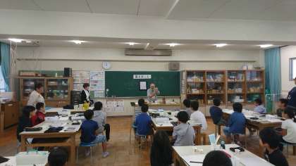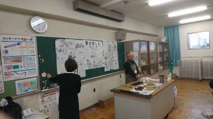墨絵教室の講師の方々に来てもらい、筆や割りばしを使って墨の絵のかき方を教わりました。習字と墨絵の筆の違いや、雪舟から始まった墨絵の歴史も聞くことができて、とても勉強になりました。