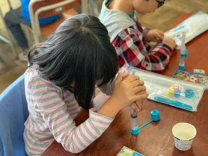 「全然押せない!」「空気とちがう!」など水は空気と違って押し縮めることができないことに気づくことができました。
