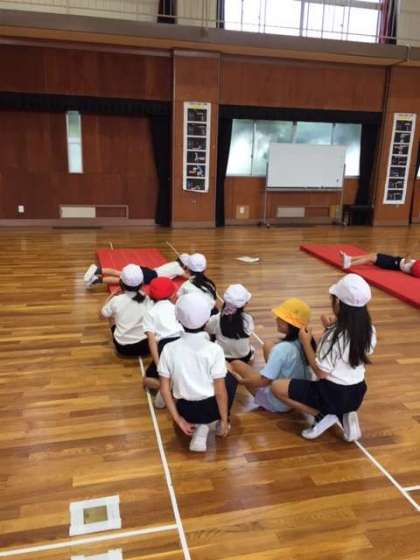 今日の体育は、先週から引き続きマットを使った運動遊びをしました。今日は、班で応援したり、うまくできるようにアドバイスし合う姿が見られました。