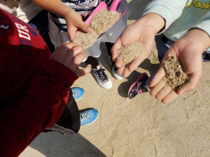 乾き具合を調べるために、土を触ってみて「色も違う!」と気づいた児童もいました。