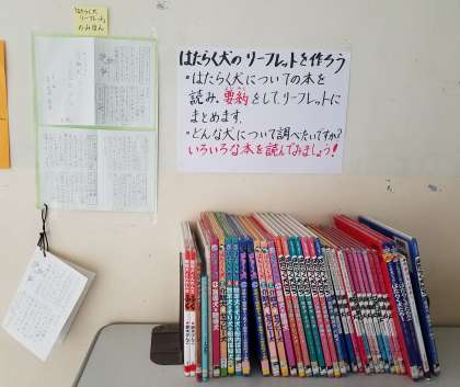 学習の後半では、他のはたらく犬についての本を読んで、調べてまとめる学習を行います。大阪市立図書館から団体貸出で借りた図書を廊下に並べて、いつでも読めるようにしています。