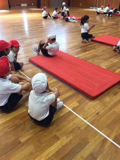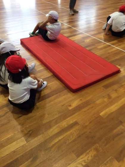 今日の体育は、後ろまわりに挑戦しました。前まわりも、後ろまわりもかけ声を決めています。前まわりは、「ユーラユーラパッ!」後ろまわりは、「ユーラユーラ足タッチ!」です。授業の始まりには、念入りに体操とストレッチを行い、子供達はグループでかけ声をかけ合い、どうやったらもっとうまく回れるかを伝え合っていました。